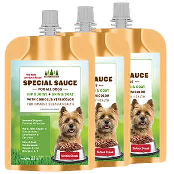 A groundbreaking first in the pet industry, our Special Sauce for Dogs is an all-in-one wellness option designed for immune support and overall vitality. Powered by Coriolus Versicolor, a renowned mushroom for immune modulation, this formula also combines the benefits of our Hip & Joint and Skin & Coat blends—delivering targeted support in every drop you mix with their food. Packed with Vitamins, Omega 3-6-9, Glucosamine, Chondroitin, Carotene, and Natural Antioxidants, it’s a true nutritional powerhouse. And with its irresistible sirloin steak flavor, even the pickiest pups will lap it up.