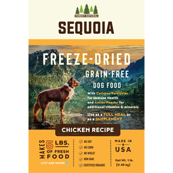 The Sequoia Freeze-Dried Grain-Free Dog Food is our most nutritious food made with the highest-quality, whole food ingredients, which is prepared in small batches right here in the United States in a human-grade kitchen. And with the added immune-supporting Coriolus Versicolor mushroom and mineral-rich antler powder...your pet is getting next level goodness. It is a fantastic combination of digestibility and palatability making it a perfect way to introduce natural feeding into your pet’s diet. This all-natural, grain-free recipe is an ideal choice for a pet with food sensitivities or a picky eater. You can use it as a full meal, food topper, or a supplement.