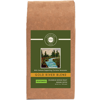 Gold River Blend is a rich, medium roast de-caffeinated, Columbian coffee that is ground to perfection and includes the powerful immune-supporting supplement known as Coriolus Versicolor. This coffee is roasted, ground, and shipped much faster than most coffees found in stores and at your local coffee house, ensuring what we believe to be the freshest coffee flavored experience you can have. Every hand-packed bag is filled with the exceptional coffee you deserve. These large beans feature undertones of juicy lemons, brown sugar, and milk chocolate that create a medium bodied, sweet tasting decaffeinated coffee with a rich flavor and aroma. If you are new to buying freshly roasted coffee and don’t know where to begin, or it you’re a veteran, this selection will satisfy your coffee craving!