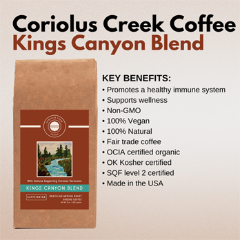 Kings Canyon Blend is a rich, medium roast caffeinated Brazilian coffee that is ground to perfection and includes the powerful immune-supporting supplement known as Coriolus Versicolor. This coffee is roasted, ground, and shipped much faster than most coffees found in stores and at your local coffee house, ensuring what we believe to be the freshest coffee flavored experience you can have. Every hand-packed bag is filled with the exceptional coffee you deserve. You will be surprised by how smooth and light it is on your palate!